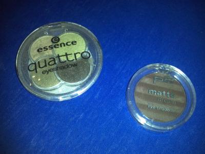 links: essence quattro eyeshadow in der Farbe 08wood you mind? (4er Lidschattenpalette in schönen Farben: nude/beige, hellgrün, khaki und braun, jeweils mit ein paar sehr schönen aber dezenten Glitzerpartikeln)